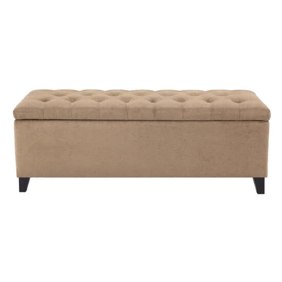 This modern storage ottoman accentuated with button tufting provides ample storage and features an elegant fabric with rich colorful legs. Leg assembly requiredΒ