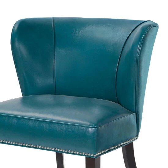 The Madison Park Sheldon Armless Accent Chair introduces a bold, modern update to elevate a classic design. Flaunting an armless wingback design, this accent chair features individually placed silver nail heads to create an elegant trim on the faux leather upholstery. High-density foam filling offers and solid wood frame provides exceptional comfort and support. The solid wood legs showcase a dark finish that creates a beautiful contrast with the faux leather upholstery, for an eye-catching look. Sleek and stylish, this armless accent chair adds character and unique style to your living room. Leg assembly is required.
