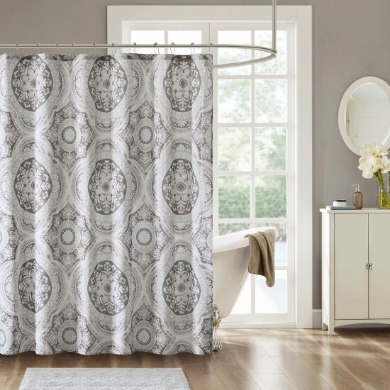 Our Madison Park Torin Printed shower curtain provides a casual, yet sophisticated update to your bathroom decor. This shower curtain flaunts a beautiful medallion motif in grey and soft blue highlights, bringing a fresh touch of color and style to your space. Made from 100-percent cotton percale for a beautiful quality and natural appeal; this shower curtain is machine washable for easy care. Complete the collection with coordinate bedding, available and sold separately.