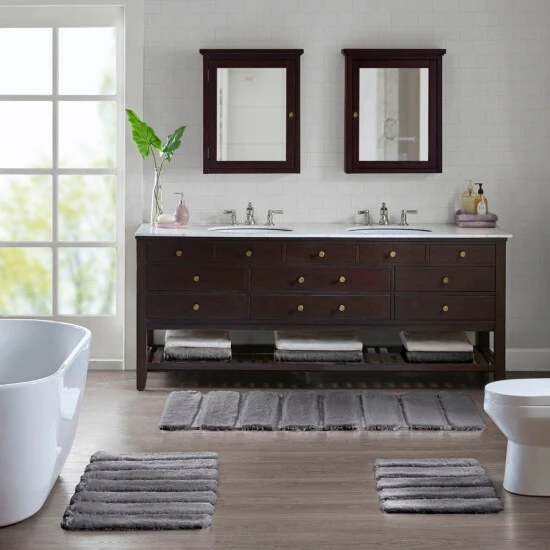 Transform your bathroom into a simple and stylish haven with our Madison Park Tufted Pearl Channel Rug. This solid tufted bath rug features a high-low stripe design with a light sheen and luster that adds rich dimension and texture for the perfect shabby chic touch your bathroom decor. Constructed from 100-percent macro-spun polyester fibers, each tufted bath rug is also durable for long-lasting, incredibly soft, and also OEKO-TEX certified, meaning it does not contain any harmful substances or chemicals for quality comfort and wellness. Machine washable for easy care and available in a soft palette of fade and stain resistant colors, this tufted bath rug is the perfect addition to complete any bathroom decor!