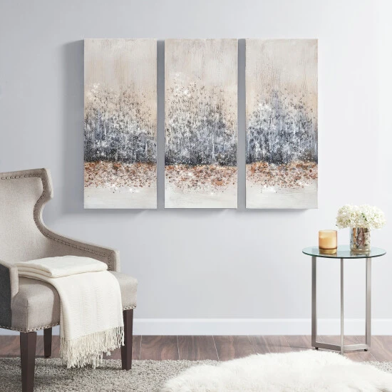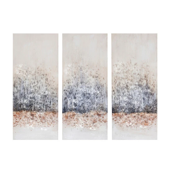 Bring contemporary style to your decor with this ‘Twilight Mystere’ triptych canvas art. The canvas pieces feature an abstract design that gives the impression of a forest at twilight, rendered in shades of blush and grey with hand-brushed embellishments and glitter. The pieces mount easily with D-rings, and can be hung together or around your space.