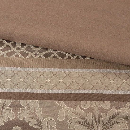 Create a positively palatial focal point in your bedroom with the rich, regal, and romantic look of this comforter set This multi-set glam and traditional set features a coordinated comforter, pillows, shams, and bedskirt displayed in share leaf striping and ironwork motifs with venetian brown and gold highlights. The lush and luxurious design elevates any bedroom in your home into a lavish retreat.