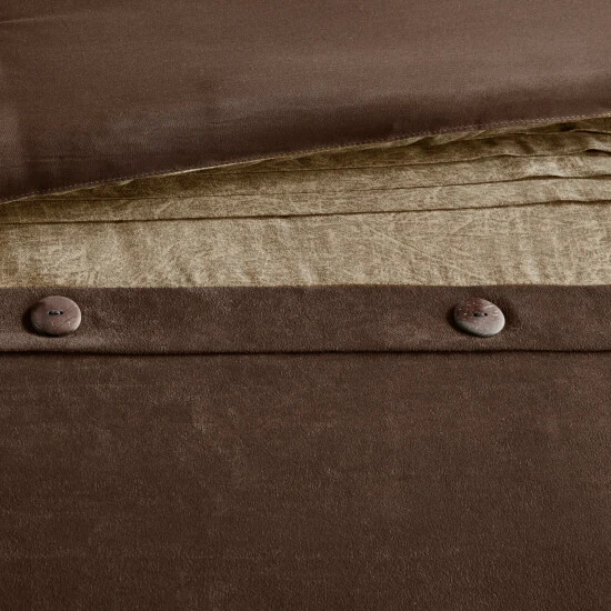- Lodge Cabin style pieced fabric and decorative buttons on top of the bed